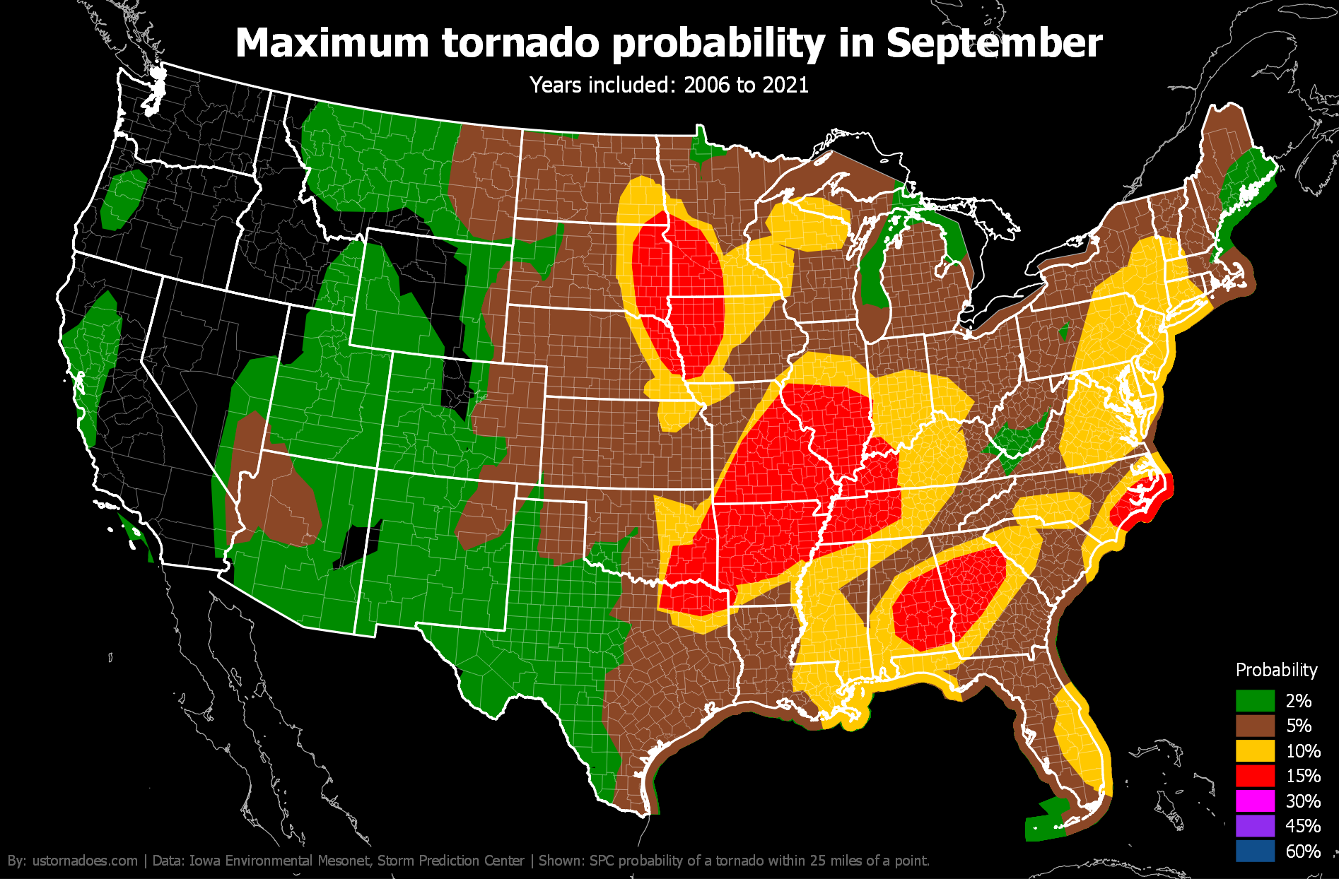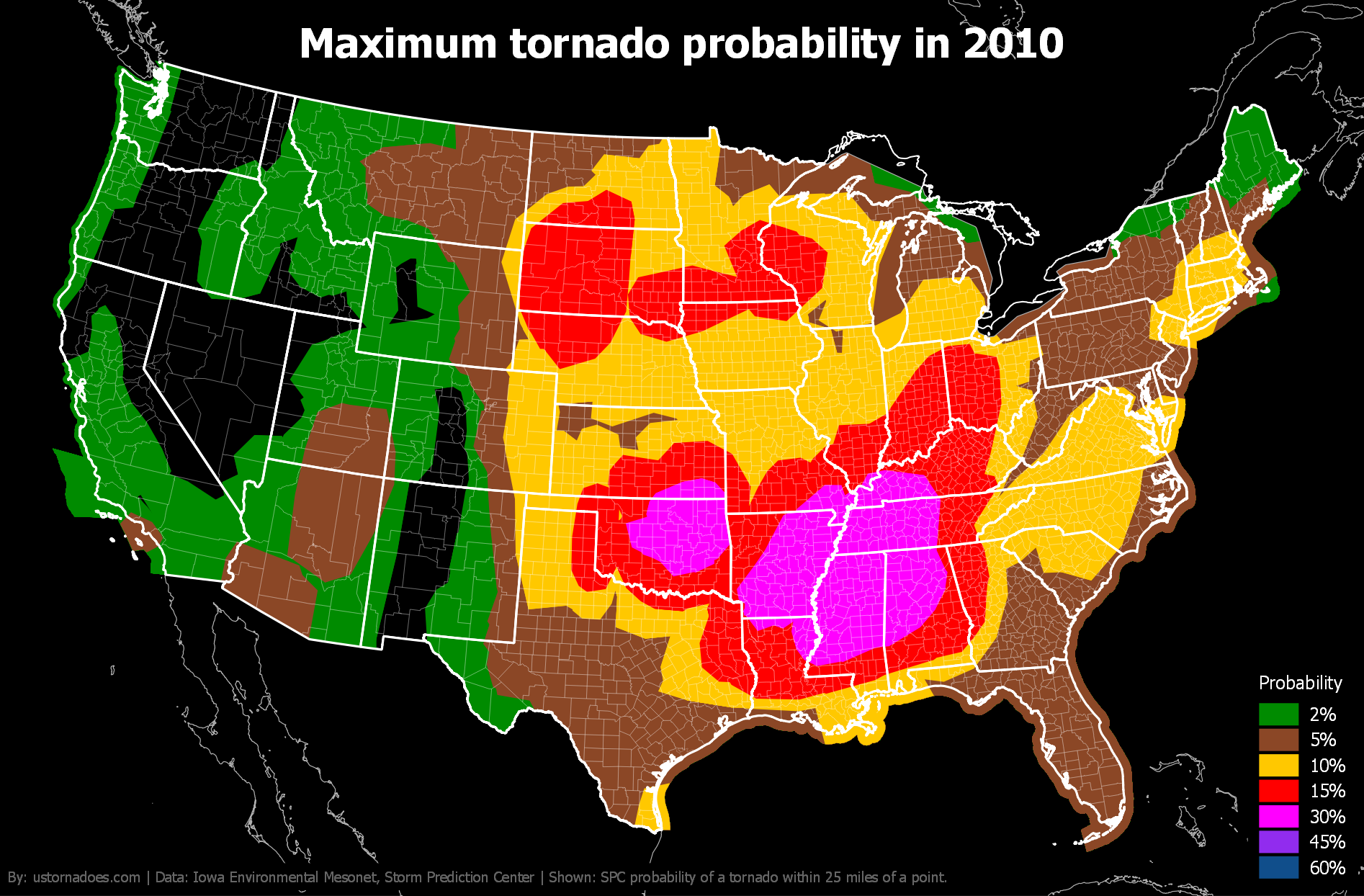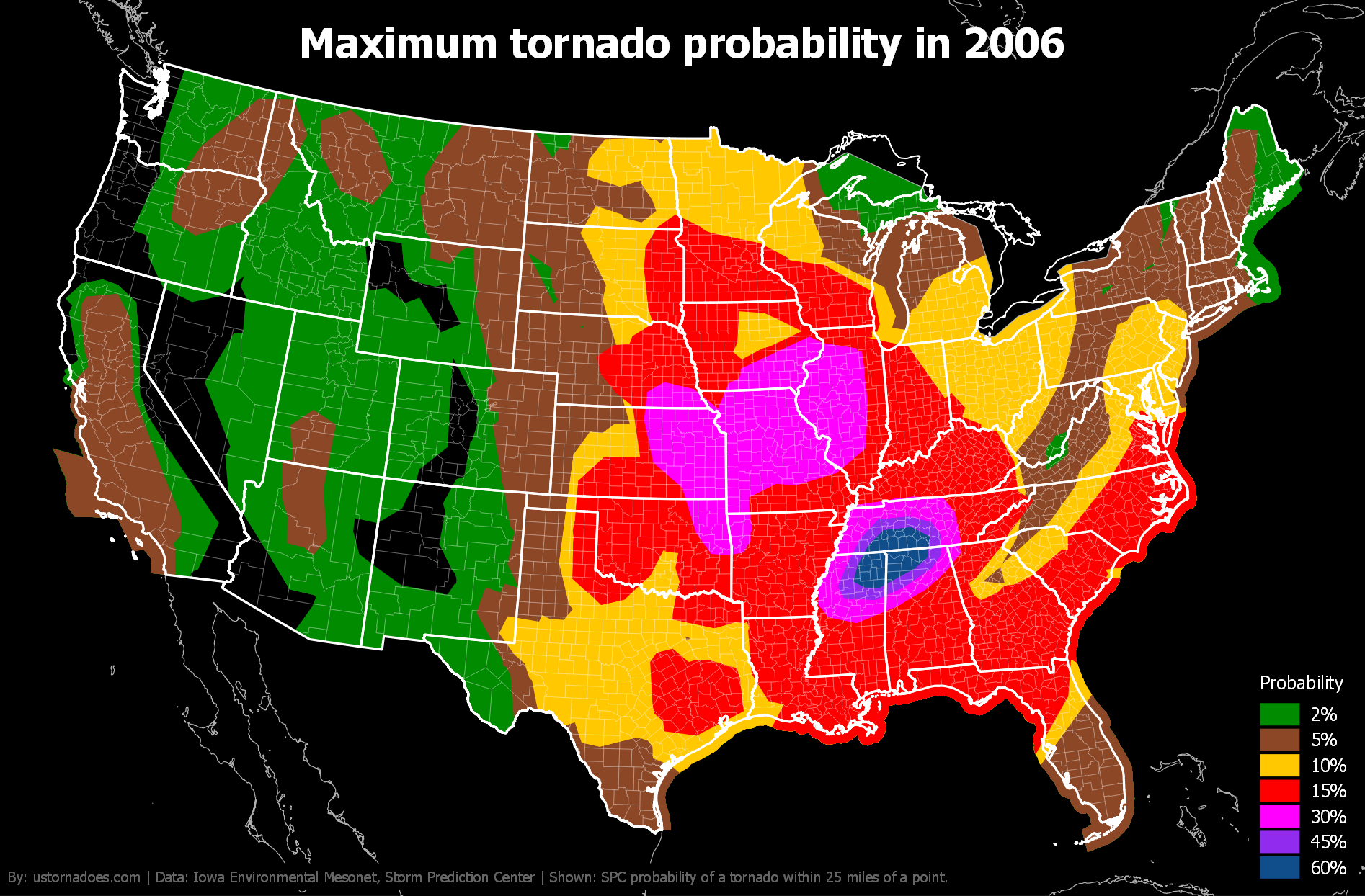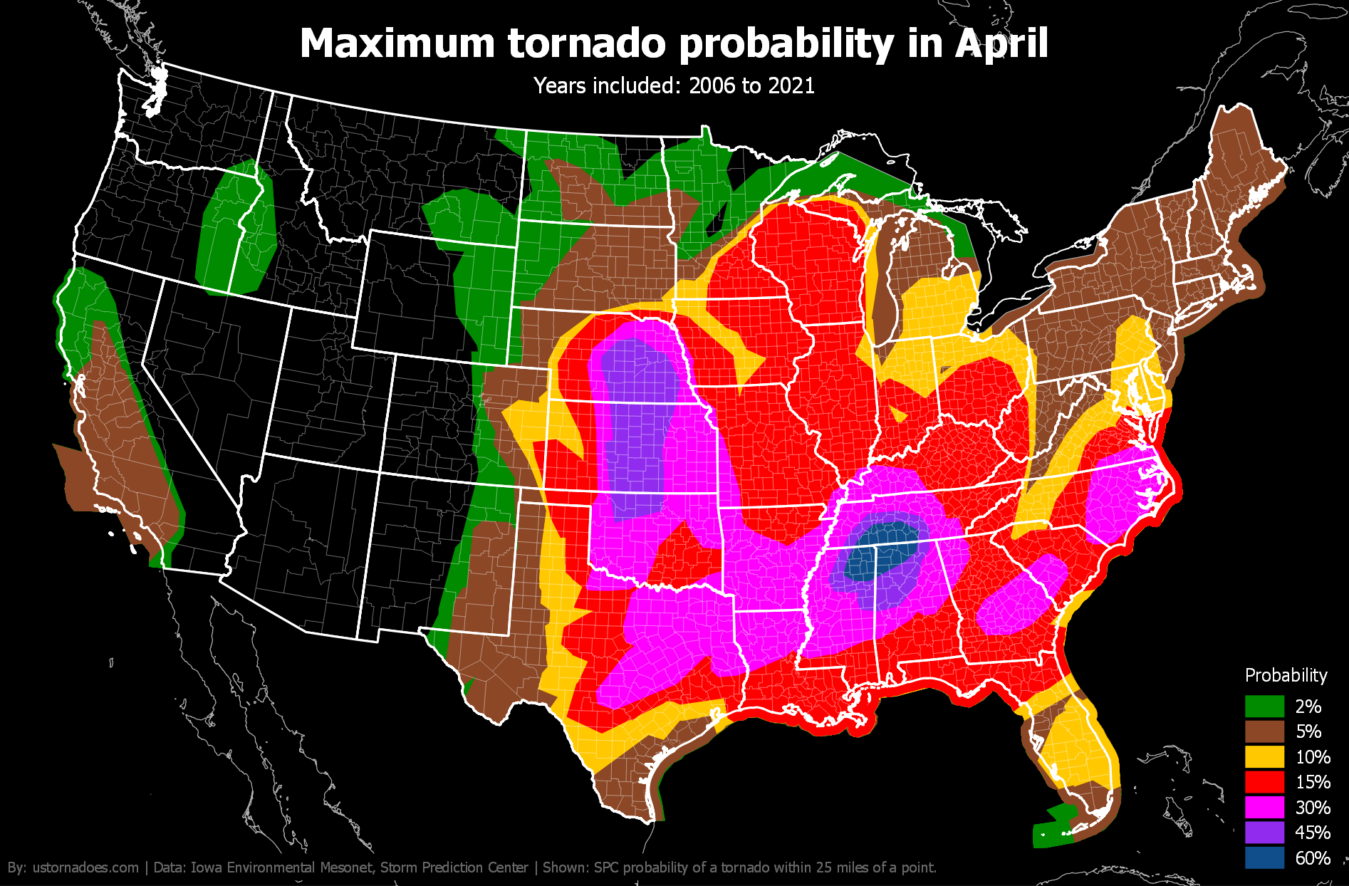 Like tornadoes, the SPC tornado probability map shifts north and west during the spring and into summer before settling back toward the warmer South and Gulf Coast in winter.