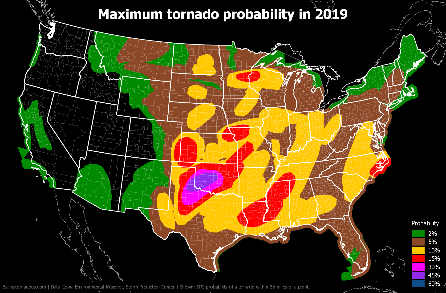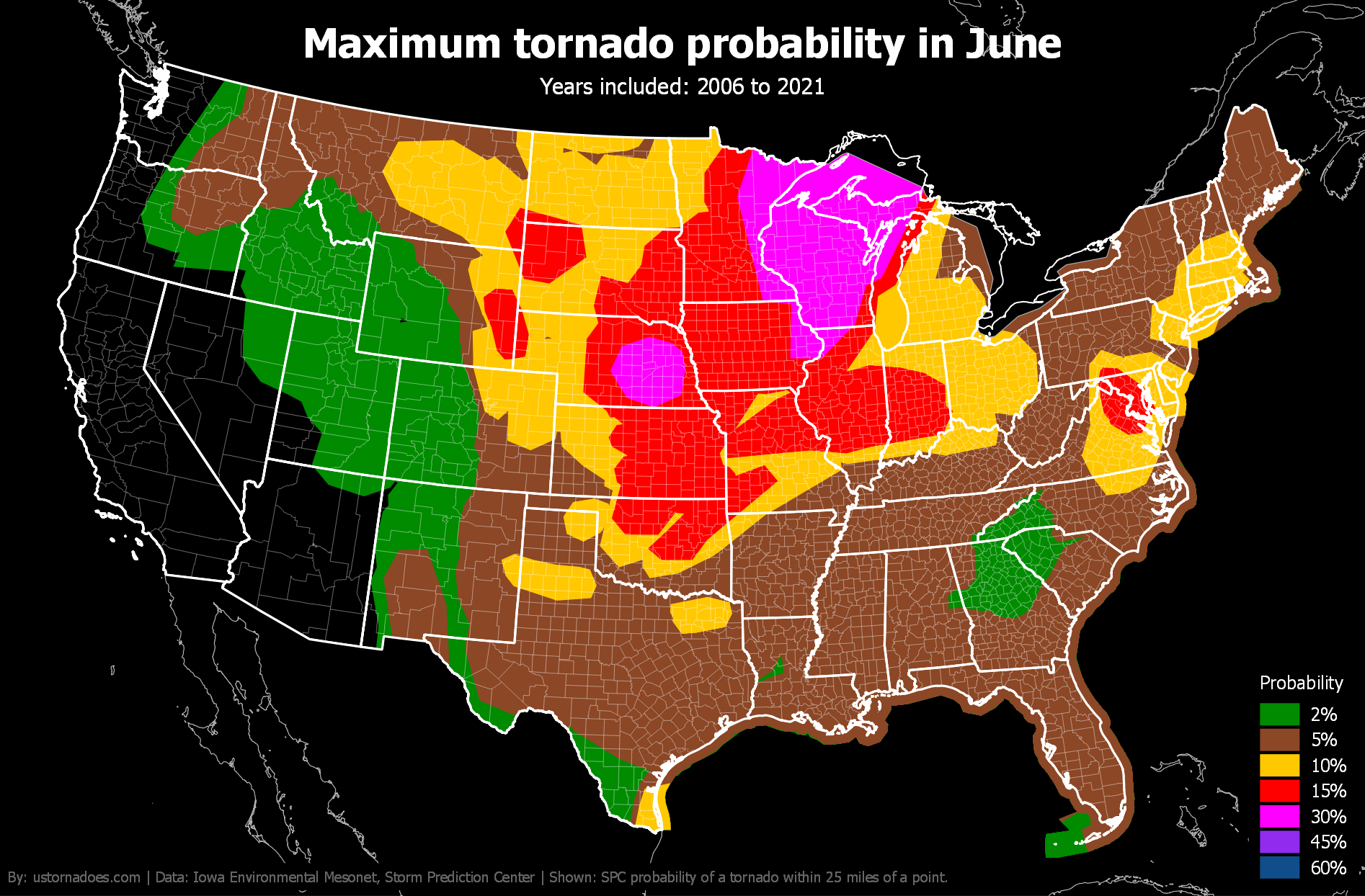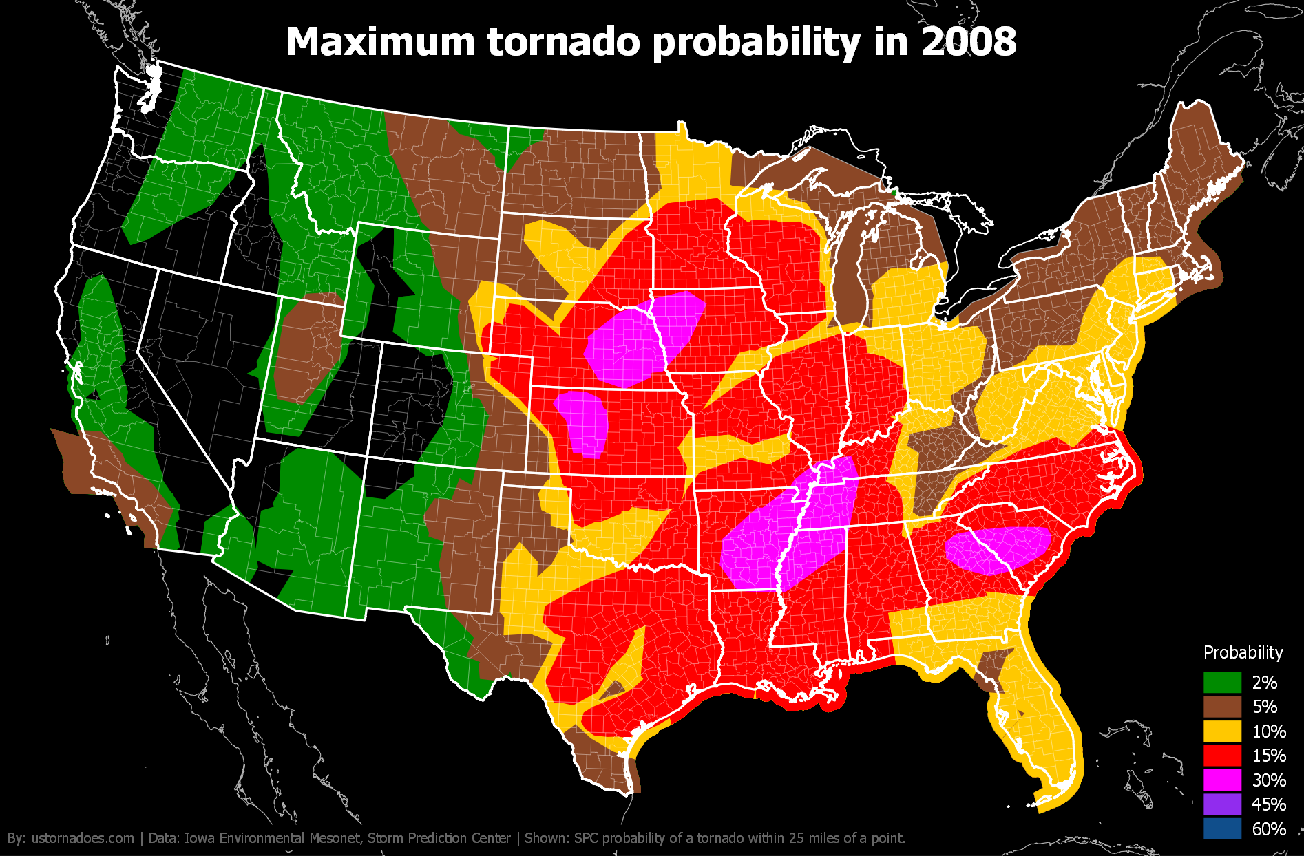 Like tornadoes, the SPC tornado probability map shifts north and west during the spring and into summer before settling back toward the warmer South and Gulf Coast in winter.