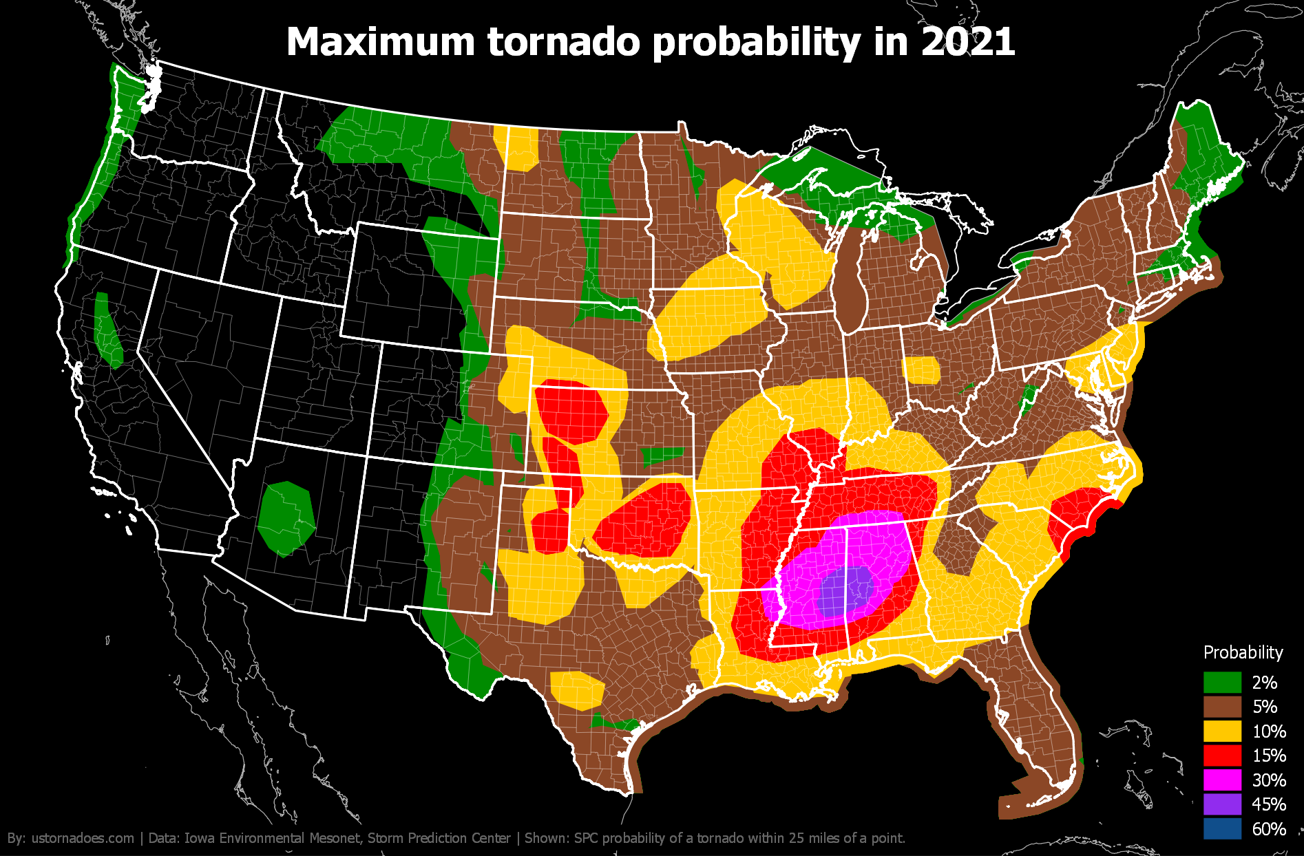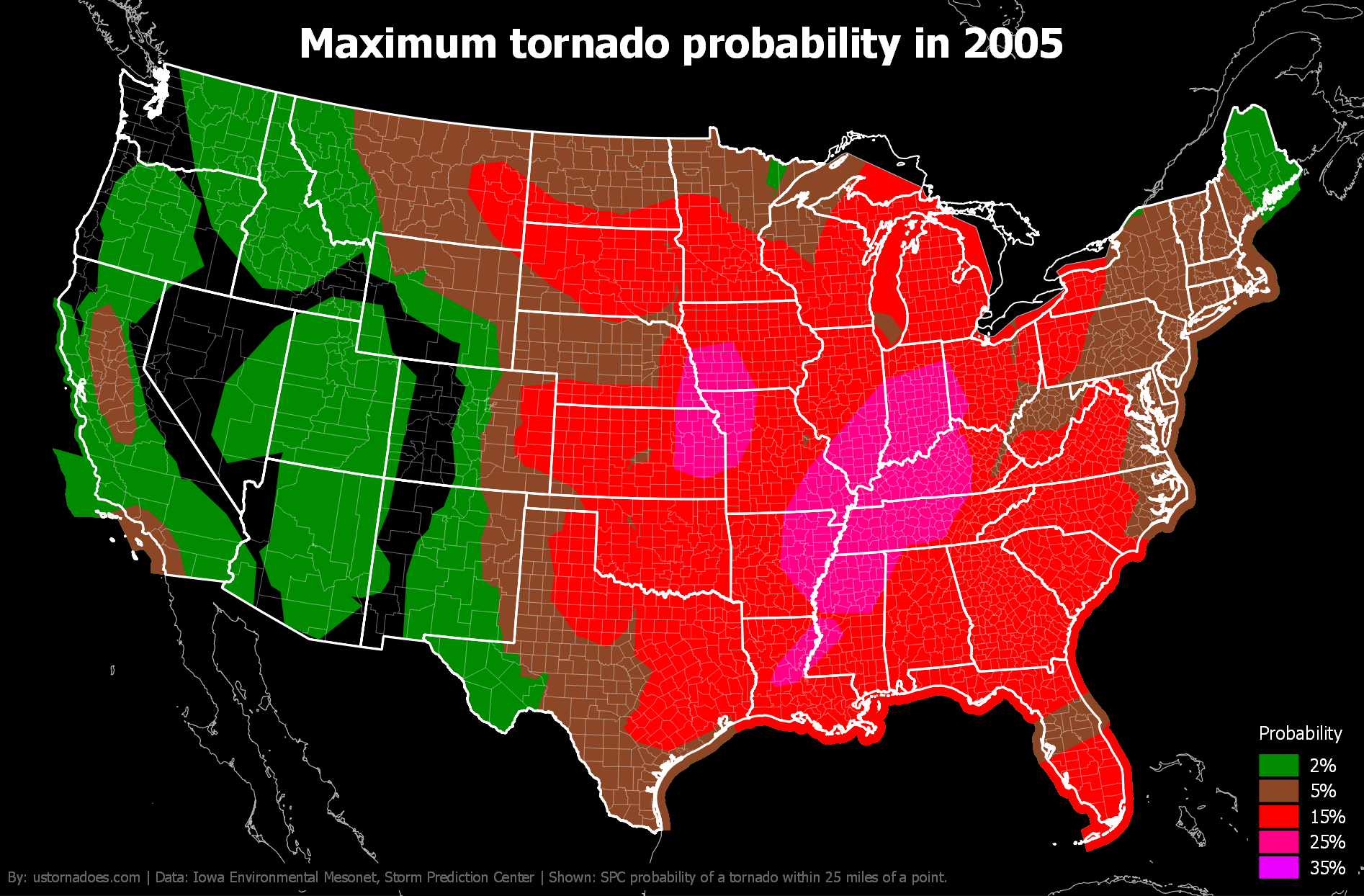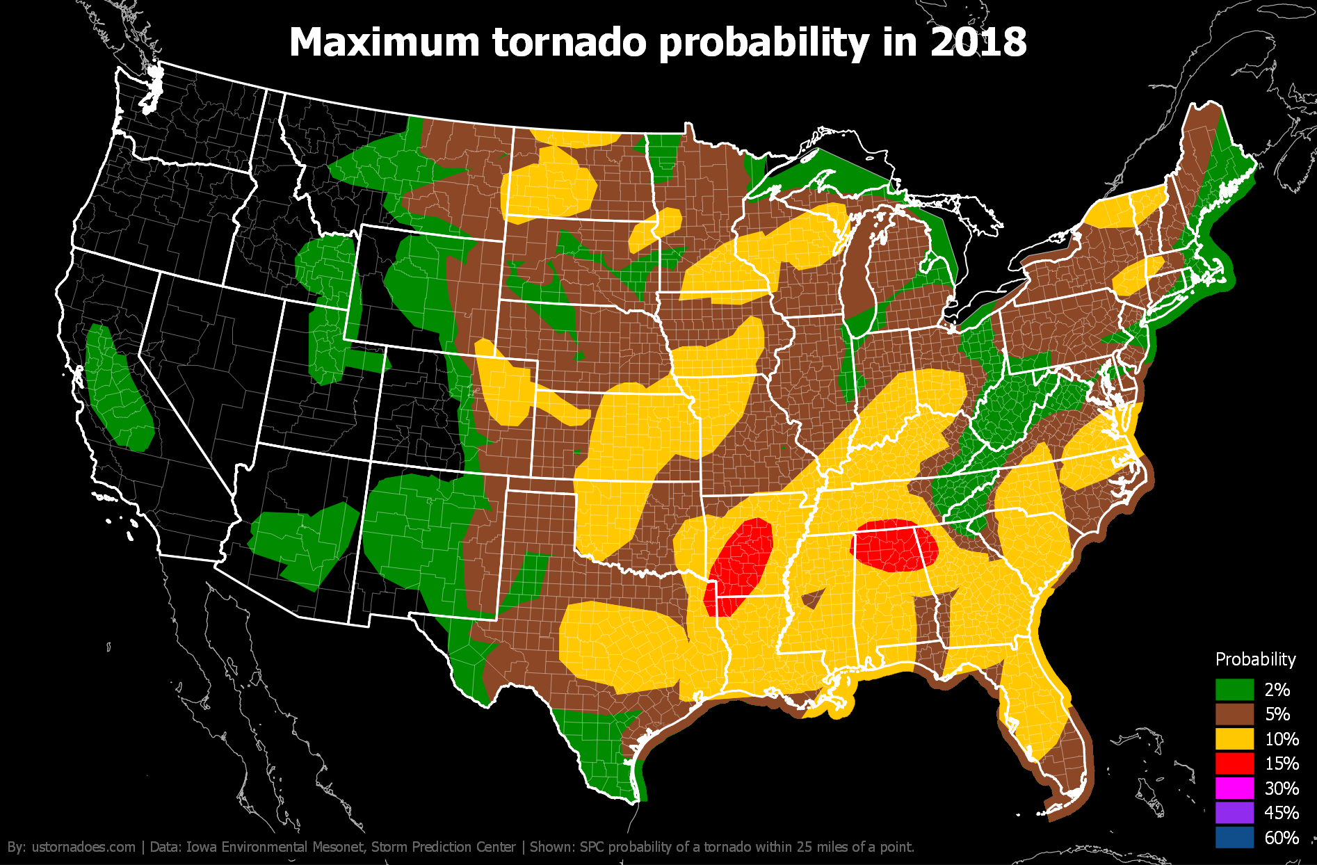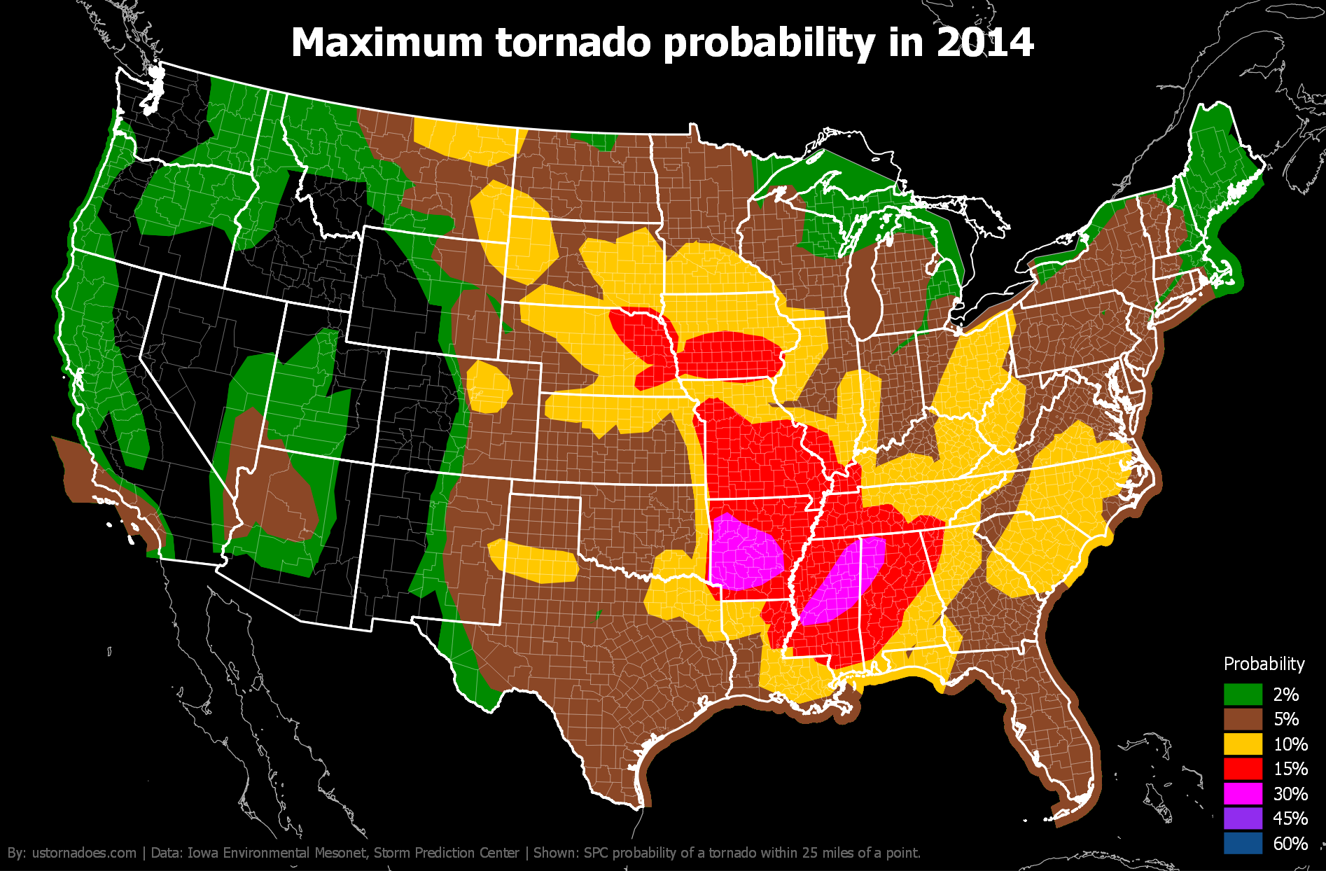 Like tornadoes, the SPC tornado probability map shifts north and west during the spring and into summer before settling back toward the warmer South and Gulf Coast in winter.