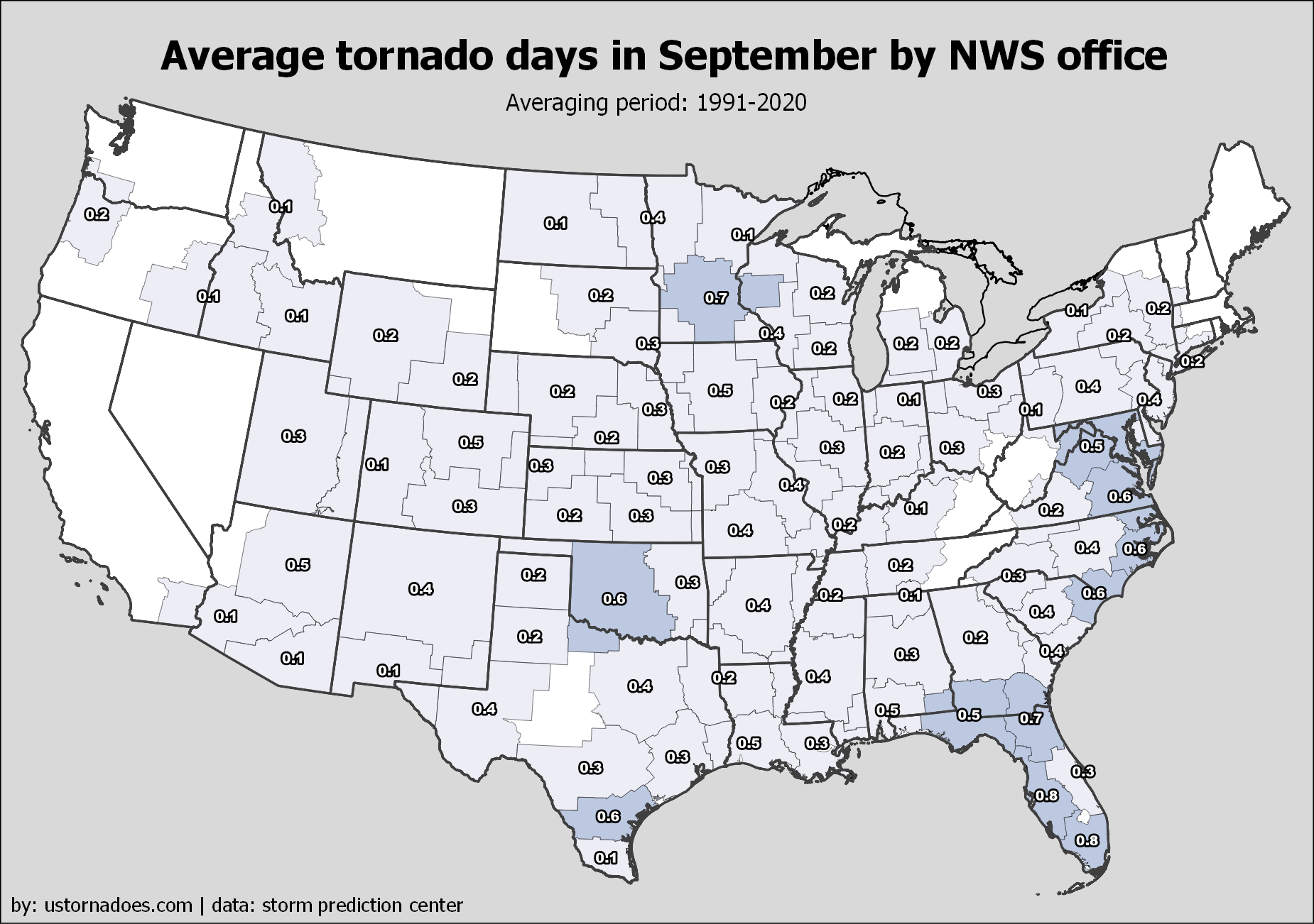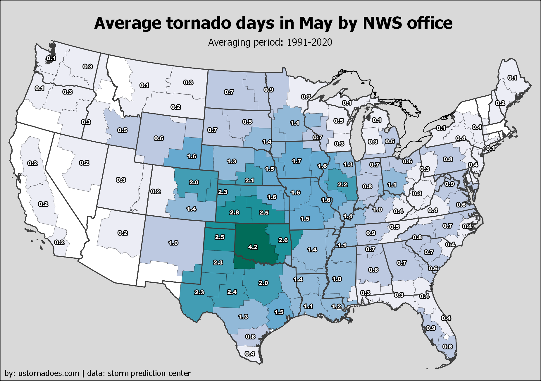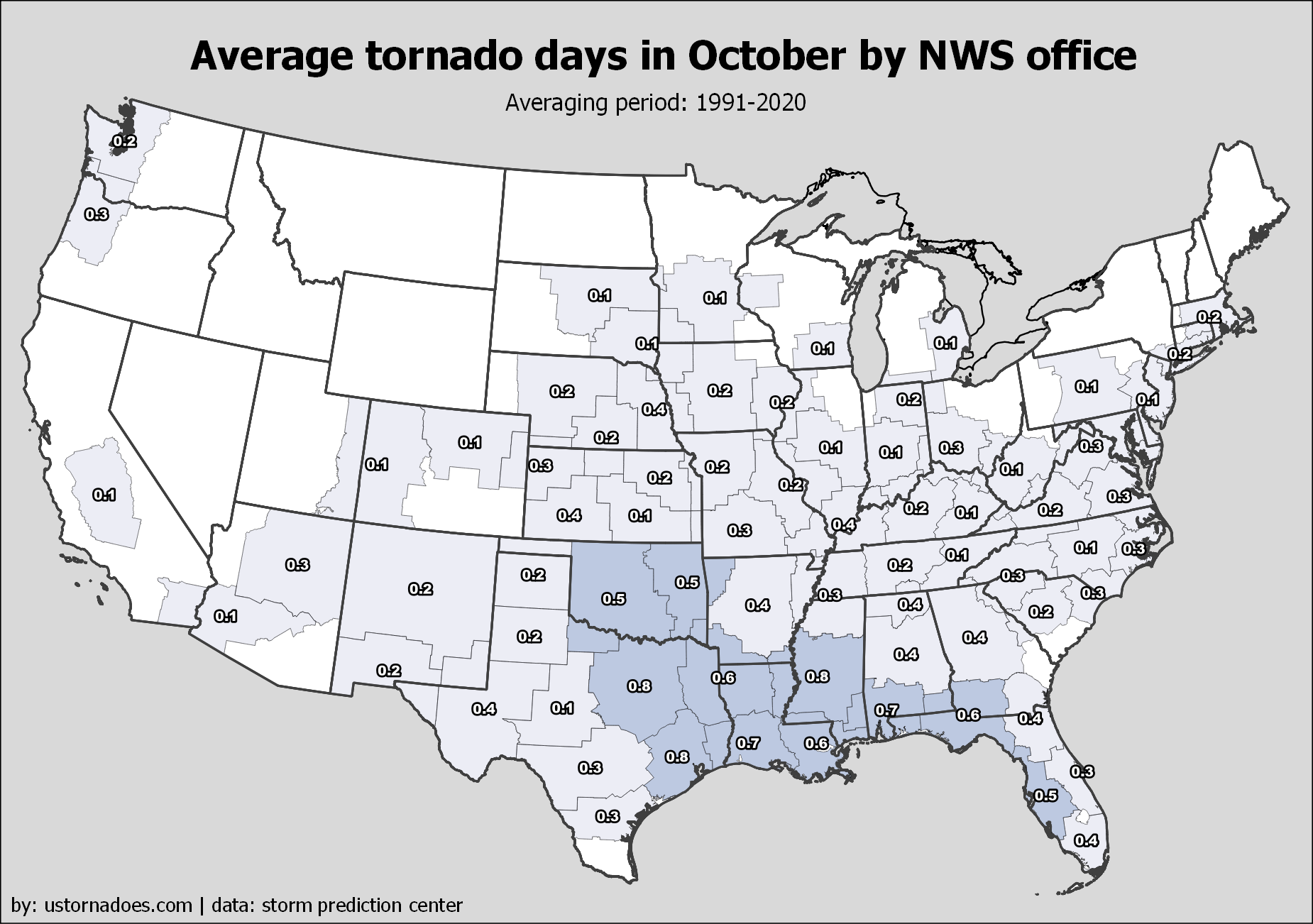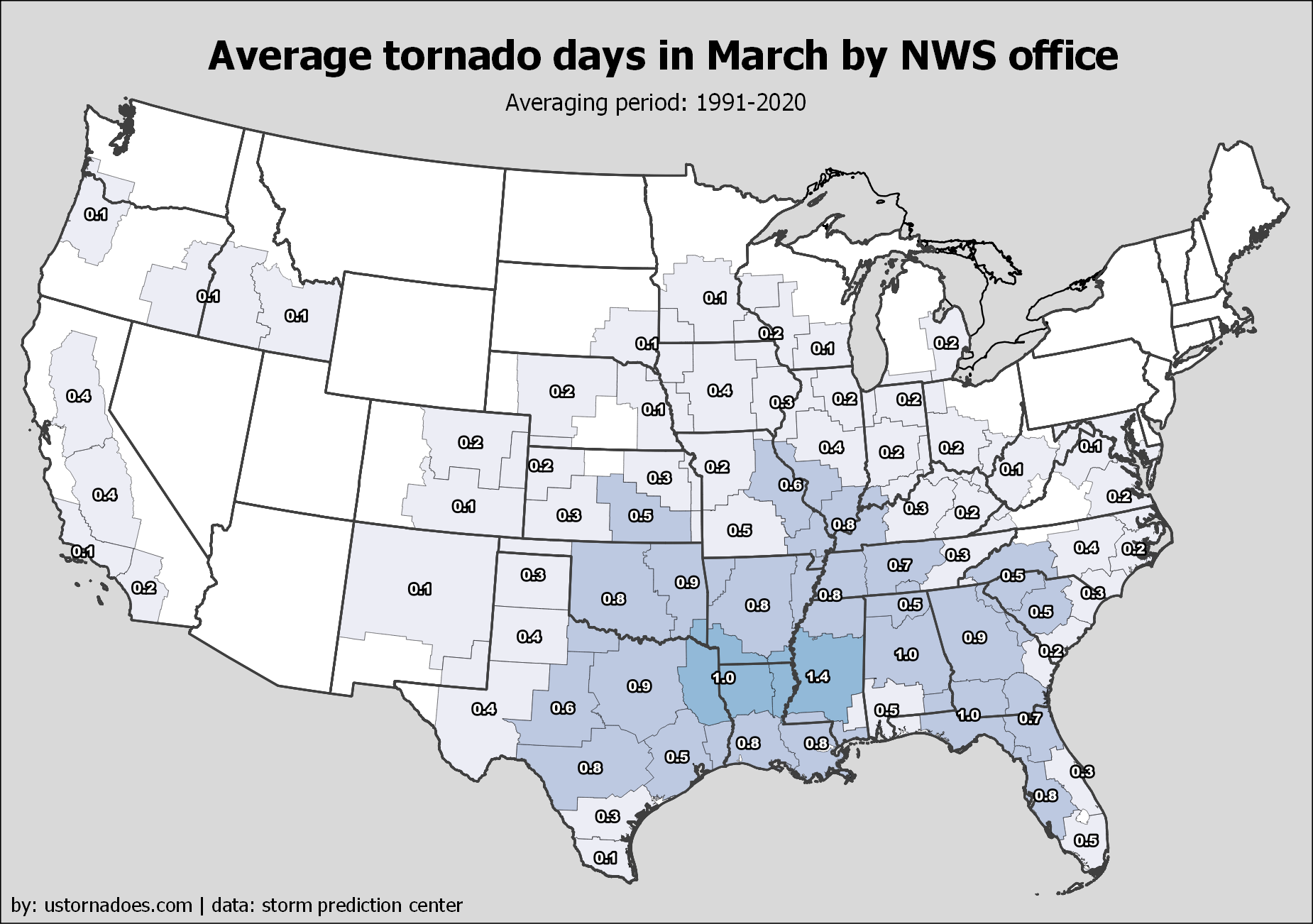 Most Central U.S. offices between the Mississippi River and the Continental Divide average about five to eight days a year with tornadoes in their warning area. Elevated numbers also include much of the South and parts of the Mid-Atlantic, as well as Ohio Valley.